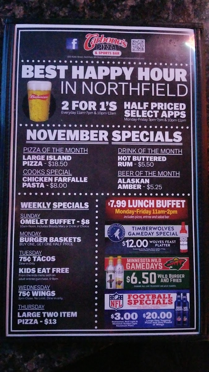 The food here complements the lively, welcoming vibe of the space—whether it’s a casual bite paired with a drink at the bar or a shared meal during local events. Menu items work well for easygoing gatherings, offering something for both kids and adults to enjoy throughout the day. With a menu designed to match the approachable, cozy environment, Carbone’s invites guests to unwind and enjoy simple yet thoughtfully prepared food.