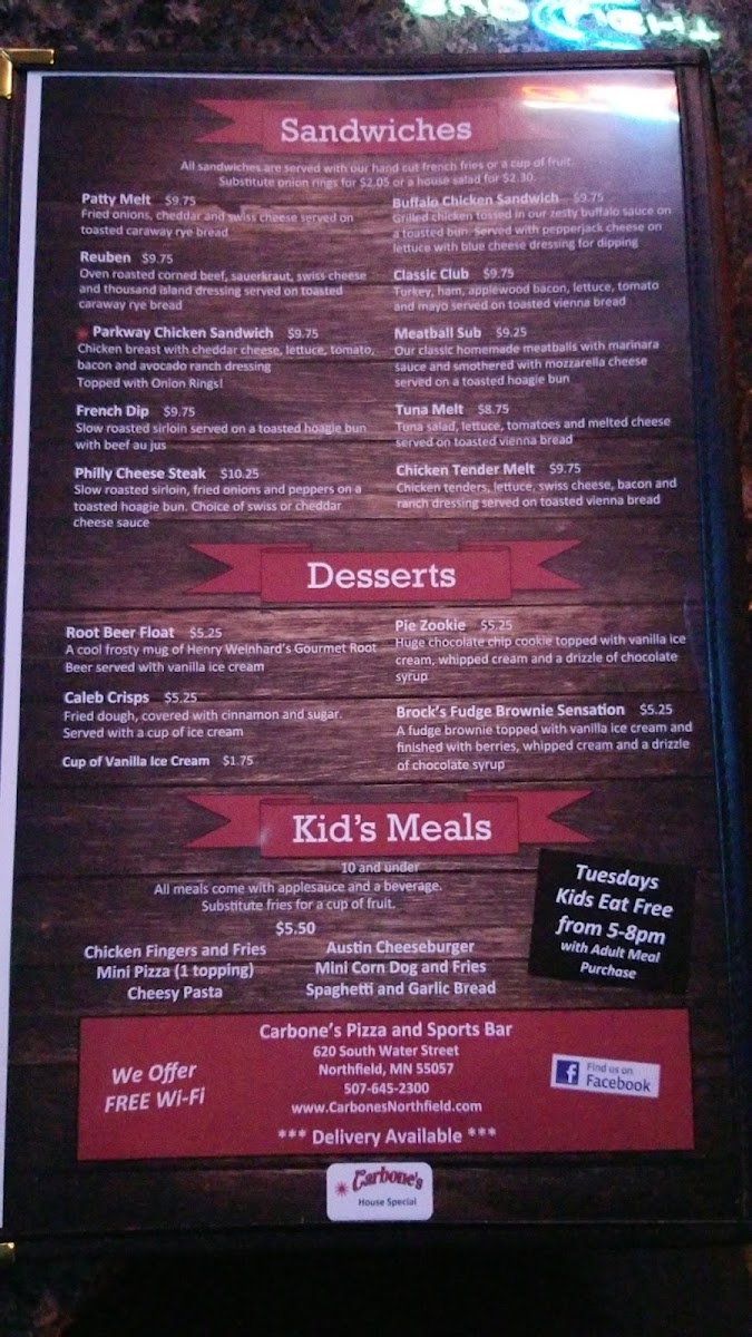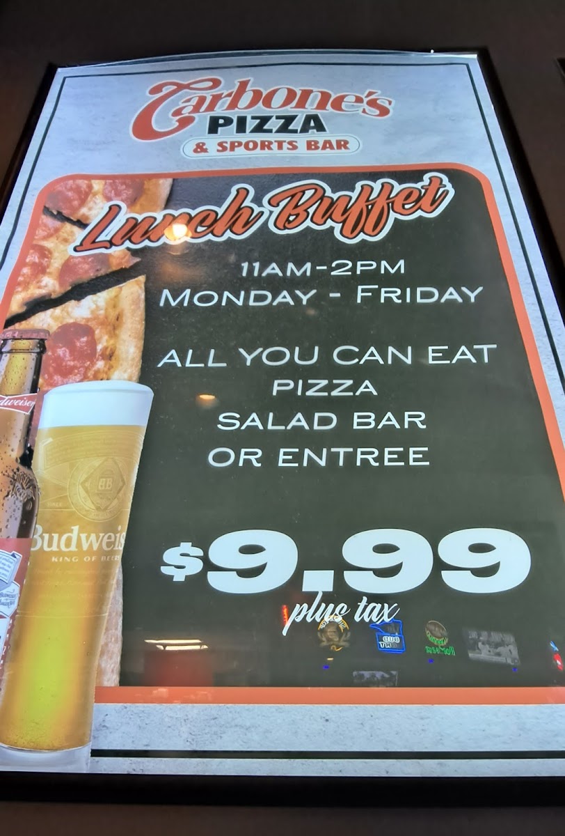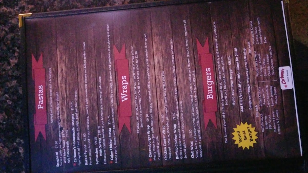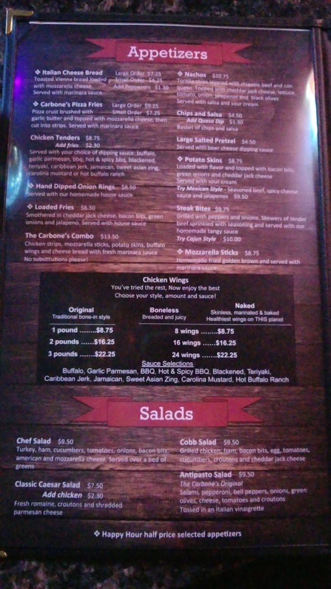 Carbone's Pizzeria offers a menu that blends casual dining with comforting, familiar flavors. The selection reflects a welcoming, laid-back atmosphere where guests can enjoy a variety of simple yet satisfying dishes. Whether you're stopping by for a relaxed lunch, a family dinner, or a night out with friends, the menu has something to suit the moment.